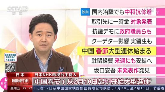 日本NHK电视台主持人:中国春节(从2月10日起)开始大型连休 ,为了防疫与往年不同,政府呼吁人们就地过年。