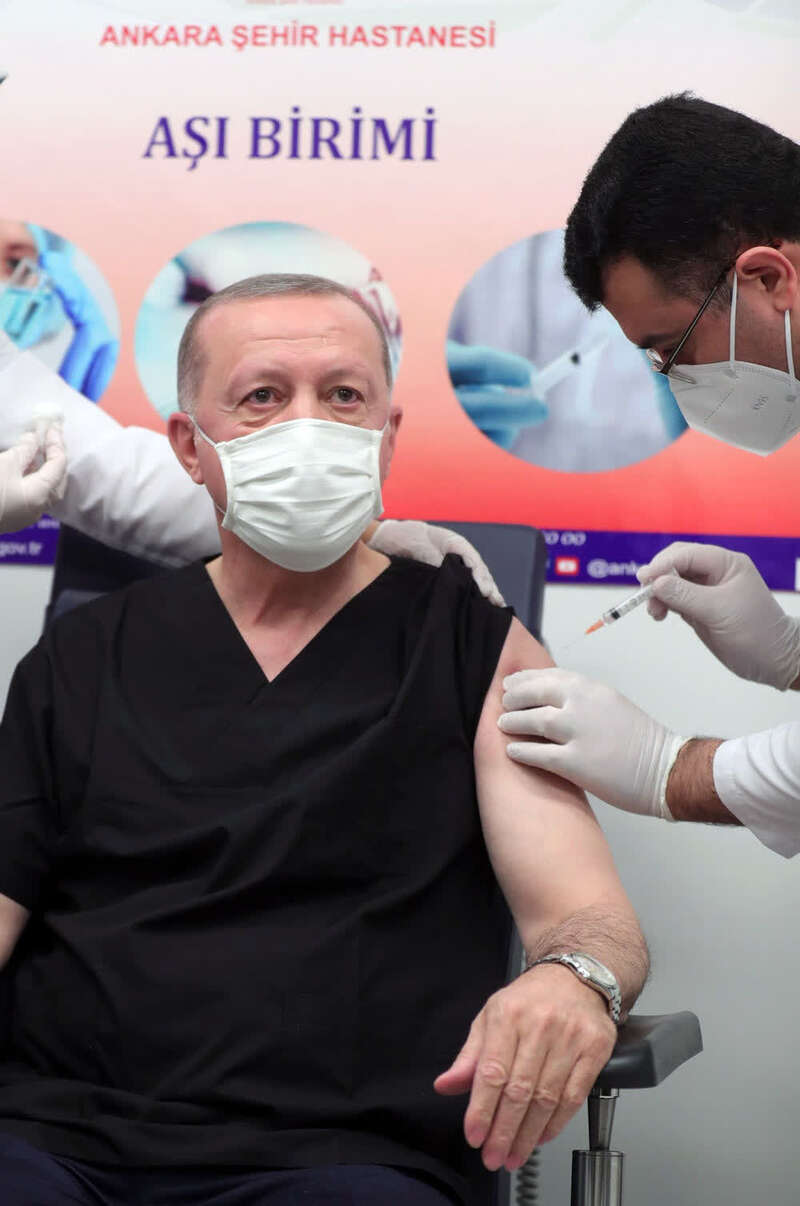 1月14日,土耳其总统埃尔多安在安卡拉一家医院接种中国新冠疫苗。新华社发