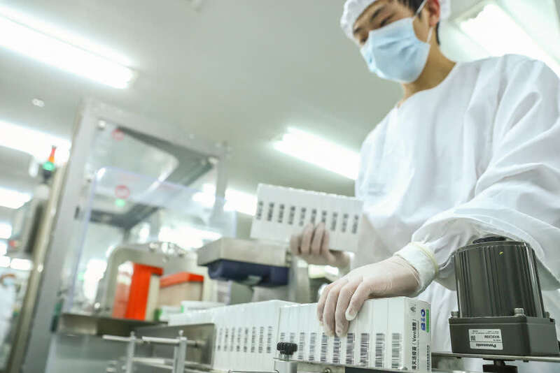 2020年12月23日,科兴中维的工作人员在包装车间展示西林瓶包装新冠病毒灭活疫苗。新华社记者 张玉薇 摄