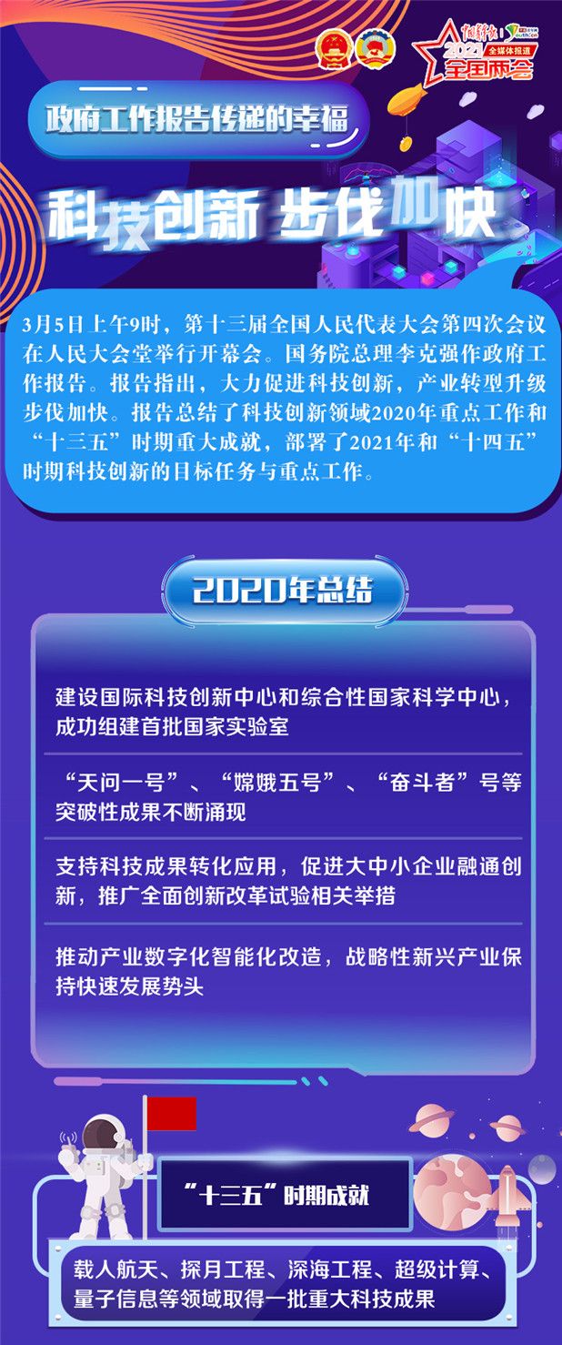 3月5日上午9时,第十三届全国人民代表大会第四次会议在人民大会堂举行开幕会。国务院总理李克强作政府工作报告。报告指出,大力促进科技创新,产业转型升级步伐加快。报告总结了科技创新领域2020年重点工作和“十三五”时期重大成就,部署了2021年和“十四五”时期科技创新的目标任务与重点工作。