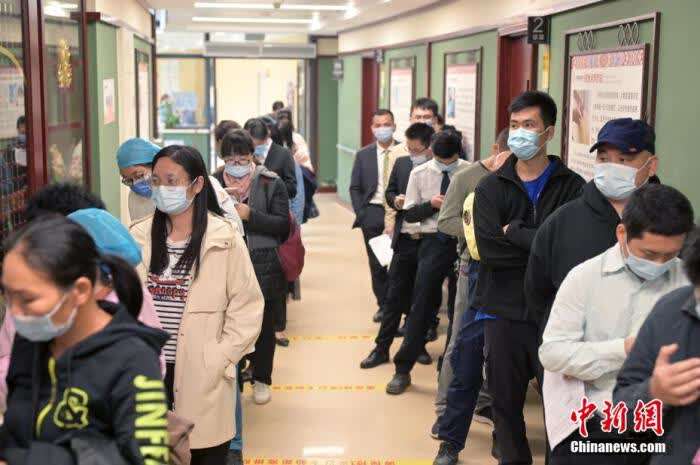 资料图:接种区外,市民排队等待接种疫苗。 俞靖 摄