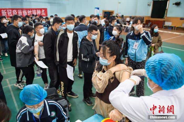 3月26日,山西太原城市学院师生在校内指定地点接种新冠病毒疫苗。 中新社记者 武俊杰 摄