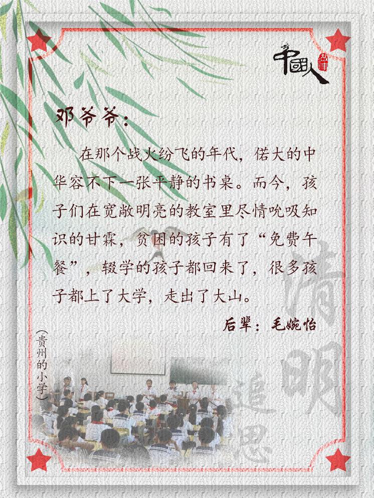 最好的纪念,便是将您的这份精神时刻铭记。天下之本在国,国之本在家,由己而家,由家而国,护国便是守家。我们邓家的家训是清清白白做人,踏踏实实做事,我已将这家训牢牢记在心里。在享受今天幸福生活的同时,肩负起年轻人的责任。大伯公,您放心吧!