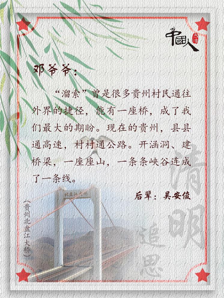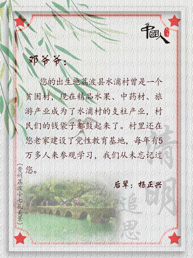 大伯公,您知道吗?我们村也脱贫摘帽了,乡亲再也不受贫困之苦了。精品水果、中药材、旅游产业成为了村子里的支柱产业。这么多年了,我们从未忘记过您,村里在咱家建设党性教育基地,每年有5万多人来参观学习。村子里还走出了很多大学生,孩子们基本都能读完高中或者职中,不会像以前一样初中毕业就出去了,出路多了,乡亲们的日子越来越有奔头。现在的贵州啊,县县通高速,村村通公路。开涵洞、建桥梁,一座座山、一条条峡谷连成了一条线。如果您能看到这些,该有多好!