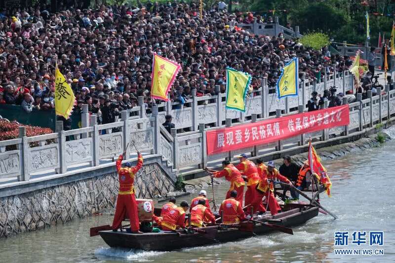 4月4日,人们在浙江桐乡市洲泉镇清河村“蚕花水会”现场进行快船比赛。每年清明时节,浙江省桐乡市洲泉镇清河村双庙渚一带都要举行水上蚕花庙会,人称“蚕花水会”,亦称“水上蚕花圣会”,活动以祭祀蚕神、佑蚕丰收为核心,进行缫丝技艺展示、水上巡游、水上民俗表演等。新华社记者 徐昱 摄