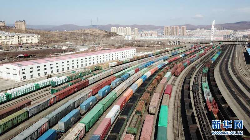 这是3月31日拍摄的黑龙江绥芬河站南场,中欧班列从这里出入境(无人机照片)。新华社记者 王建威 摄