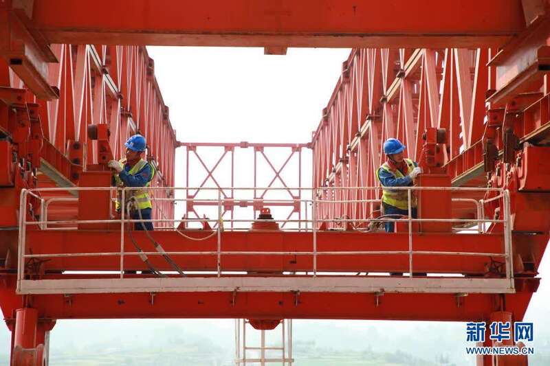 4月1日,工作人员在贵州省独山县贵南高铁银坡河特大桥节段梁架设现场作业。当日,银坡河特大桥节段梁全部架设完成,为大桥如期完工奠定基础。新华社记者 刘续 摄