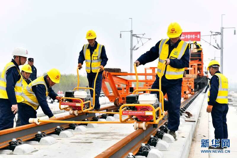3月15日,在日兰高铁山东嘉祥县段,中铁一局的工作人员进行铺轨作业。新华社记者 郭绪雷 摄