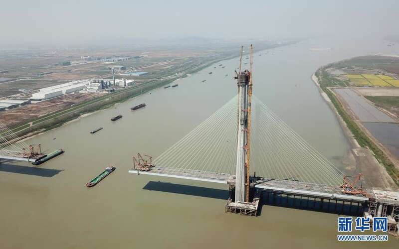 3月25日拍摄的安九铁路鳊鱼洲长江大桥(无人机照片)。当日,安九铁路鳊鱼洲长江大桥主桥北主塔封顶,至此,大桥主桥两个主塔全部封顶。新华社记者 程敏 摄