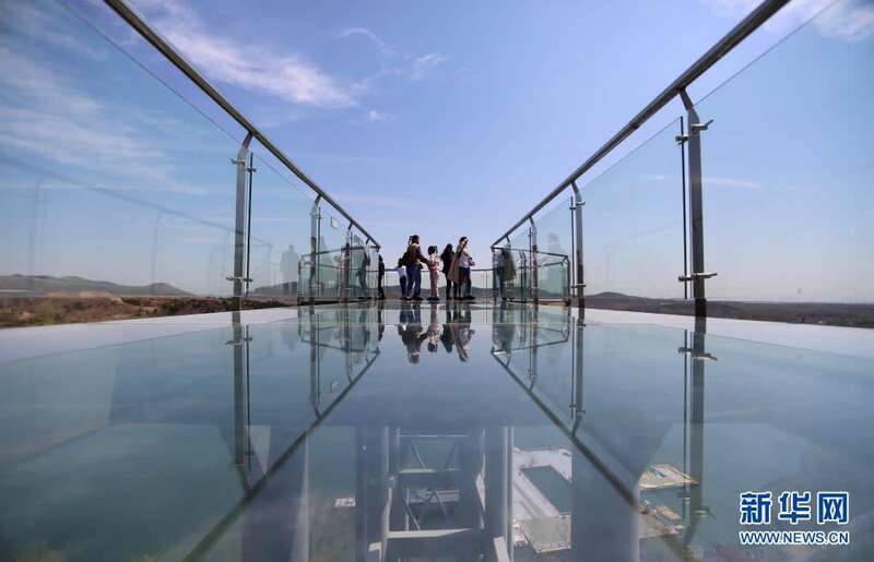 4月5日,游客在山东省临沂市沂南县红石寨景区内体验高空玻璃栈道。新华社发(王彦冰 摄)