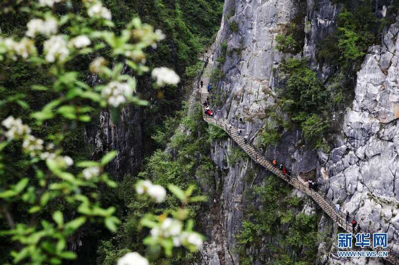 4月5日,游客在重庆市黔江区城市大峡谷景区悬崖栈道游玩。新华社发(杨敏 摄)