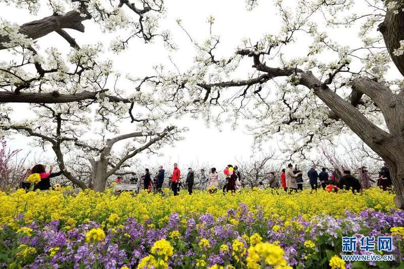 4月5日,游客在河北省石家庄晋州市周家庄乡梨园内踏青。新华社发(梁子栋 摄)