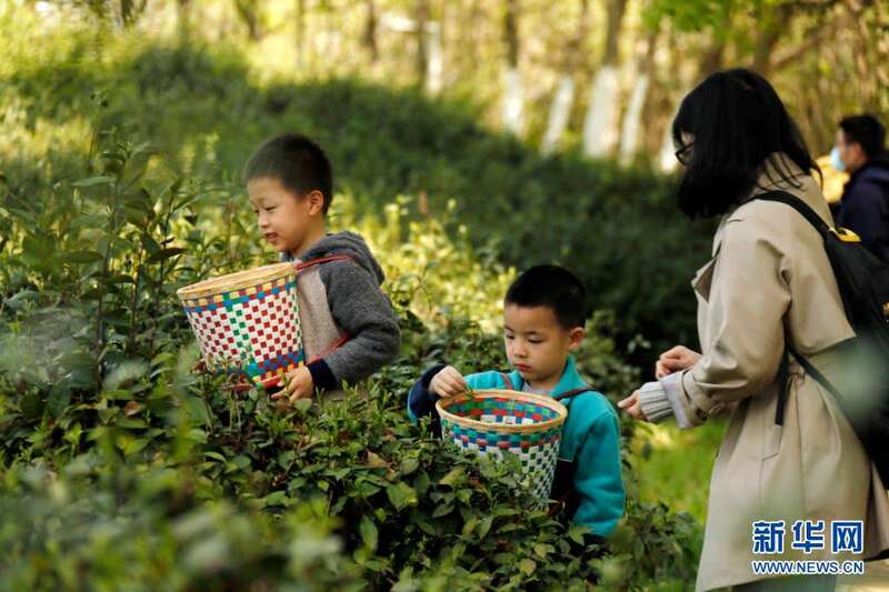 4月5日,家长陪伴孩子在南京科技馆茶园体验采茶。新华社发(孙忠南 摄)