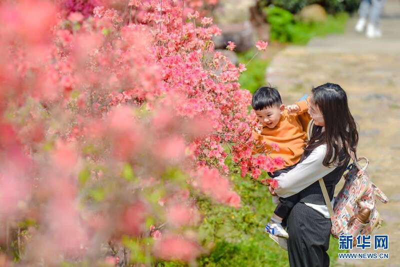 4月5日,一对母子在浙江省湖州市长兴县和平镇城山沟景区内观赏杜鹃花。新华社发(吴拯 摄)