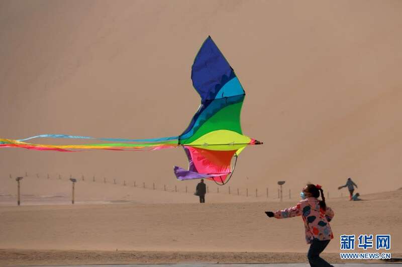 4月5日,小朋友在甘肃省敦煌市鸣沙山月牙泉景区山门广场放风筝。新华社发(张晓亮 摄)