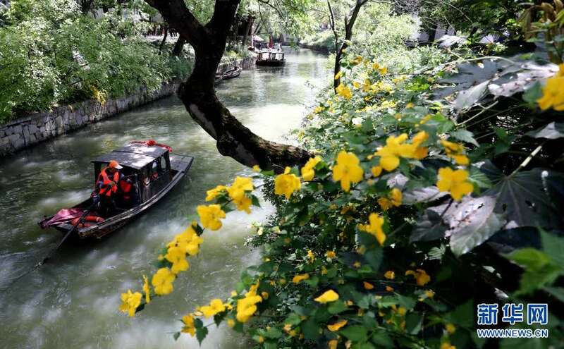 4月5日,在江苏苏州虎丘景区,游客坐在手摇小游船上赏春。新华社发(杭兴微 摄)