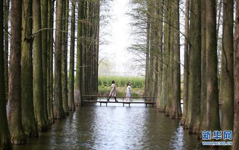 4月5日,在江苏省扬州市渌洋湖湿地公园,游客在水上森林中游览。新华社发(孟德龙 摄)