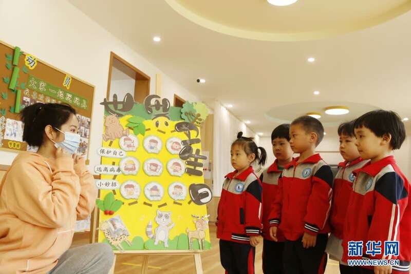 4月7日,河北省邢台市襄都区第七幼儿园的教师在给小朋友讲解正确的口罩佩戴方法。新华社发(张驰 摄)