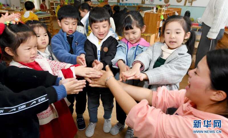 4月7日,浙江省台州市路桥区路南街道秀水铭苑幼儿园的小朋友在学习正确洗手方式。新华社发(王保初 摄)