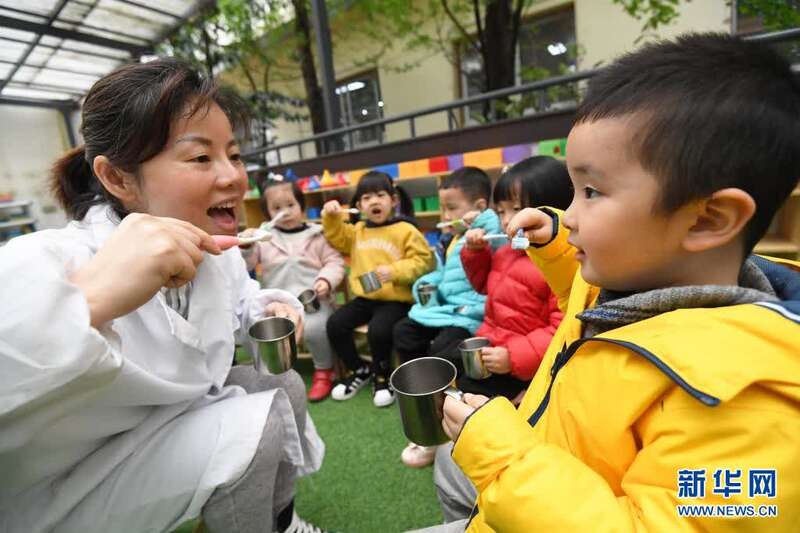 4月7日,在贵州省贵阳市第十三幼儿园,保健医生在指导小朋友们如何正确刷牙。新华社发(赵松 摄)