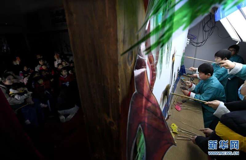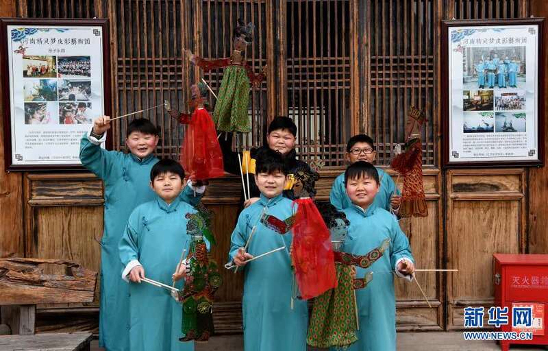 精灵梦皮影艺术团的演员和小朋友们互动(3月19日摄)。新华社记者 李安 摄