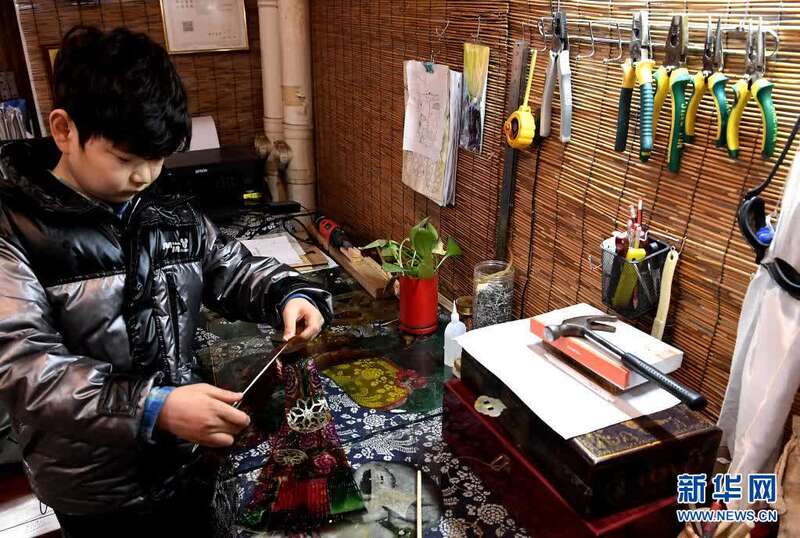 李赛在工作室里制作皮影(3月19日摄)。新华社记者 李安 摄