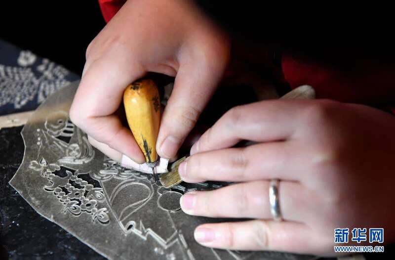 精灵梦皮影艺术团的演员在工作室里雕刻皮影(3月19日摄)。新华社记者 许雅楠 摄