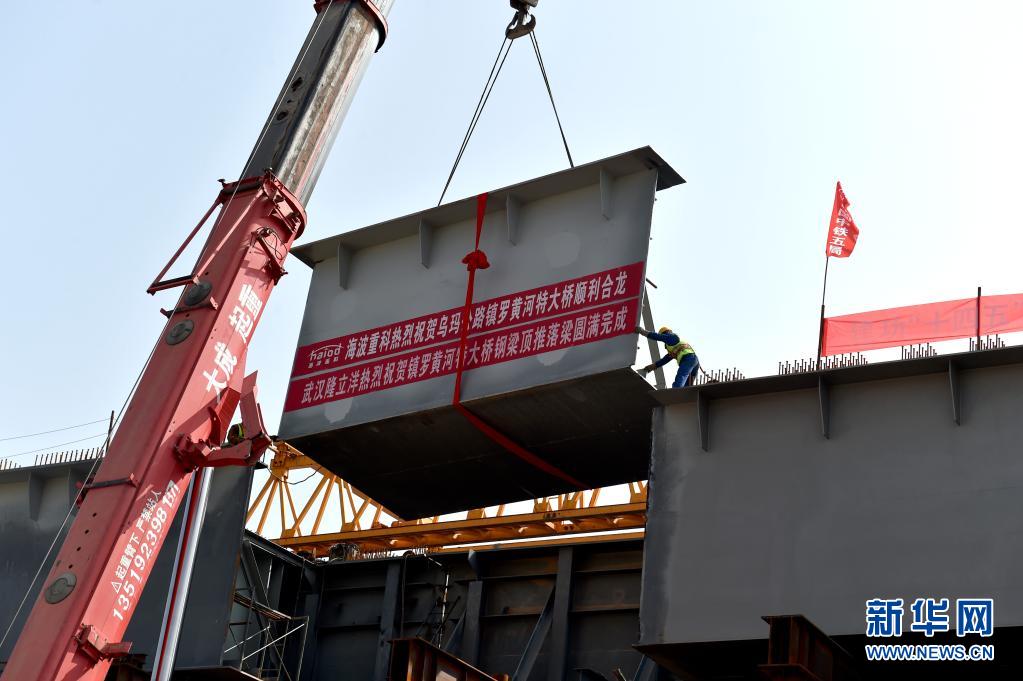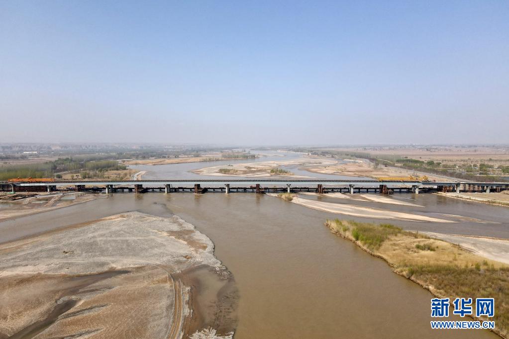 这是4月11日拍摄的乌玛高速公路镇罗黄河特大桥合龙施工现场。新华社记者 唐如峰 摄