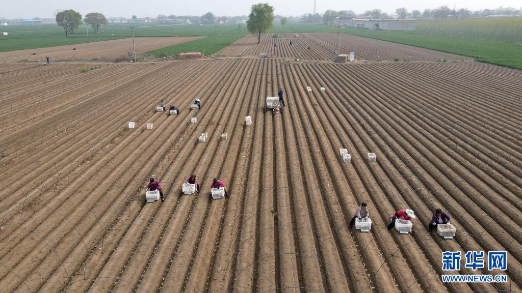 4月10日,河北邢台经济开发区沙河城镇北关村农民在种植生姜(无人机照片)。连日来,河北邢台经济开发区农民抢抓农时种植生姜,田间一派繁忙景象。新华社记者 牟宇 摄