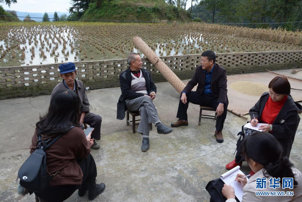 于都县革命烈士纪念馆馆员在贵州省黄平县采访于都籍失散红军钟兴明(又名钟元享)的女婿张礼平(左三)(资料照片)。新华社发(于都县革命烈士纪念馆供图)