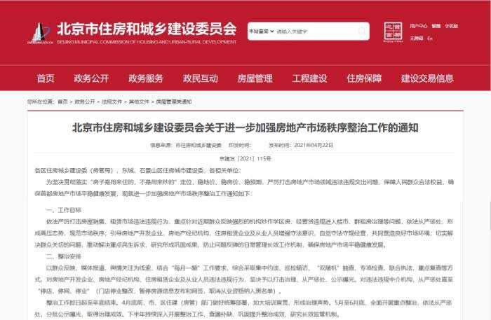 4月22日,北京市住房和城乡建设委员会发布《关于进一步加强房地产市场秩序整治工作的通知》,要求依法严厉打击房屋销售、租赁市场违法违规行为。