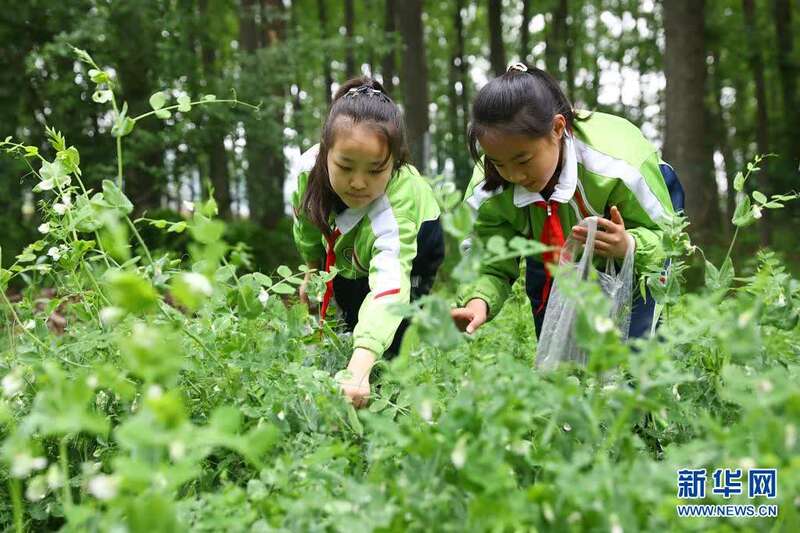 4月25日,淮北市第三实验小学的学生在采摘豌豆。
