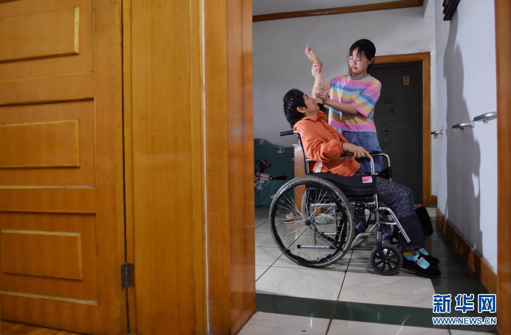 5月7日,邹晴(右)在新租的房子里帮母亲做简单的康复运动。
