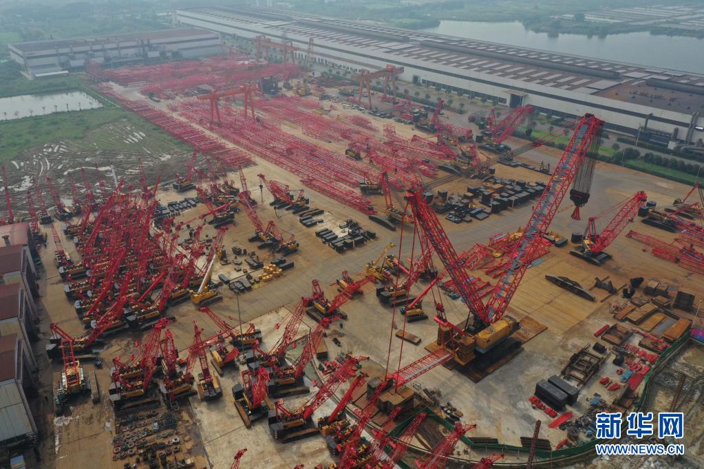 在位于浙江省湖州市吴兴高新区的浙江三一装备有限公司拍摄的等待交付的履带起重机(2020年7月29日摄,无人机照片)。新华社记者 黄宗治 摄