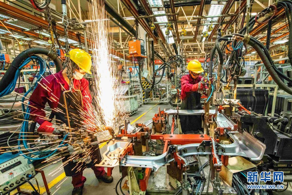 工人在山东省青州市一家汽车制造企业的冲焊车间内生产作业(2020年6月30日摄)。新华社发(王继林 摄)