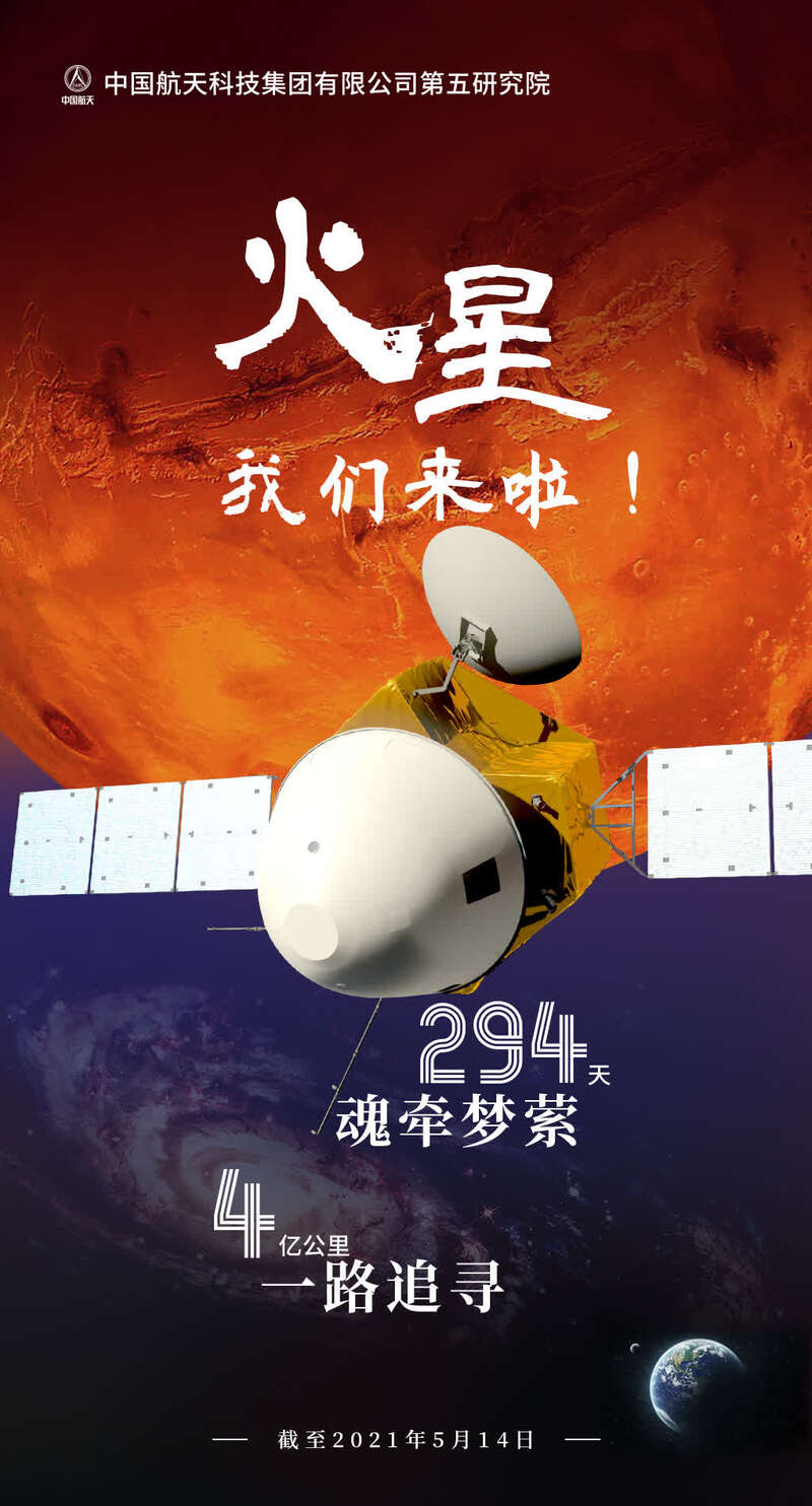 如同⼈类⽣命的孕育过程⼀样,从胚胎到⽠熟蒂落,⼤约40周的时间,需要经历⼤脑、神经、⼼肺、⻣骼等各种关键器官的发育,需要经历各种⻛险挑战,更需要爸爸妈妈的精⼼呵护;我的奔⽕旅程恰好 40余周,期间经历了四次中途修正、⼀次深空机动、两次状态⾃检、⽕星捕获、⼀次轨道⾯调整和两次近⽕制动,每⼀次动作都是⼀次巨⼤的⻛险考验,还好有航天科技集团五院的家⼈们全⼒守护,保我⼀路平安,让我的每⼀次动作,每⼀段进展,都信⼼满满,精彩纷呈。