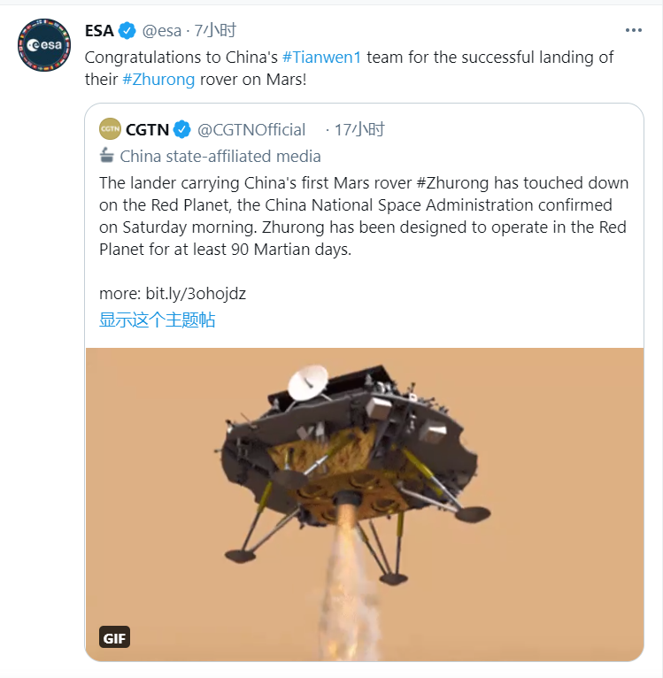当天早些时候,欧洲航天局下属的火星探测计划执行团队也在社交媒体平台上发文,向中方表示祝贺,并鼓励“天问一号”火星探测任务接下来走得更远。