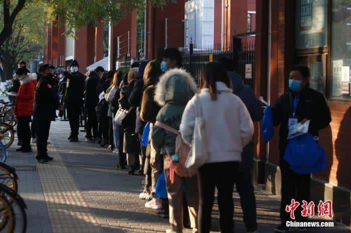 资料图:2020年11月29日,中央机关及其直属机构2021年度考试录用公务员笔试正式开考。图为北京市东城区一考点外,工作人员在核验考生信息。中新社记者 蒋启明 摄