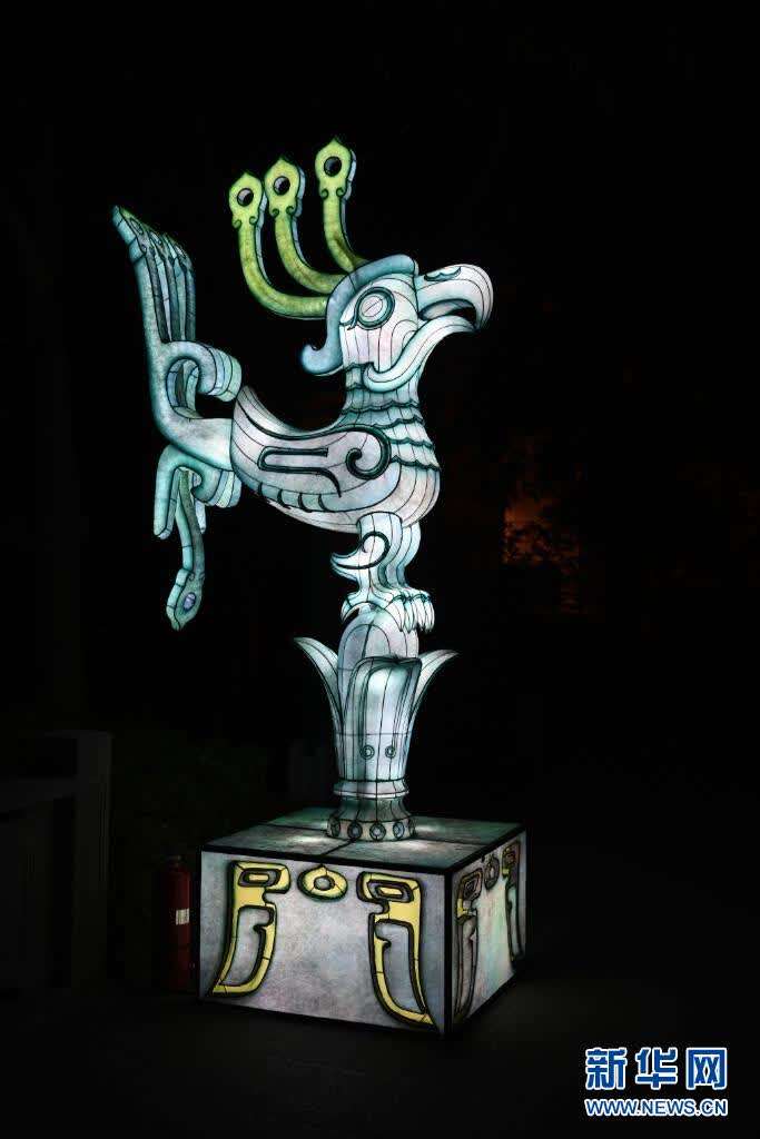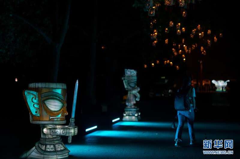 这是5月28日在四川德阳广汉三星堆博物馆拍摄的三星堆主题灯展。