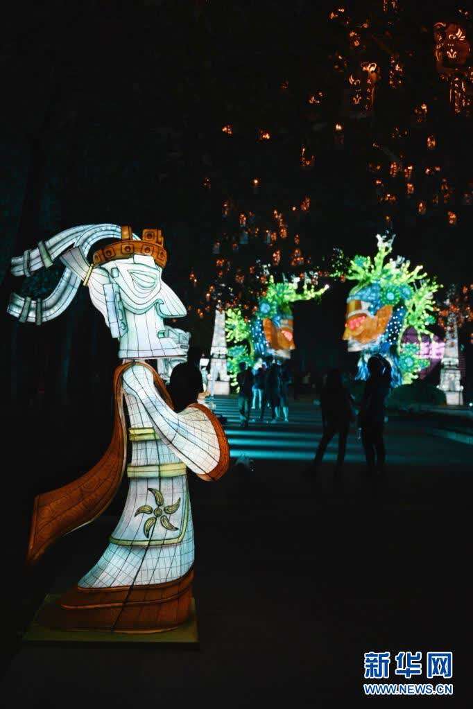 5月28日,游客在四川德阳广汉三星堆博物馆主题灯展上参观。