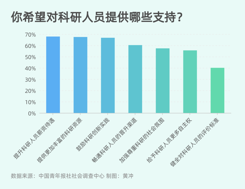 要对科研人员提供哪些支持?67.9%的受访青少年希望提升科研人员薪资待遇,60.3%的受访青少年希望畅通科研人员的晋升渠道,40.1%的受访青少年希望健全对科研人员的评价标准。