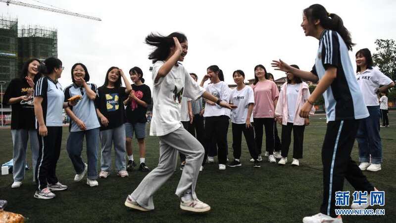 6月1日,在广西河池市都安瑶族自治县高级中学操场上,高三年级女生在玩游戏。新华社记者 张爱林 摄