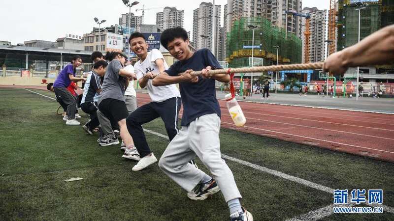6月1日,在广西河池市都安瑶族自治县高级中学操场上,高三年级学生在开展拔河比赛。新华社记者 张爱林 摄