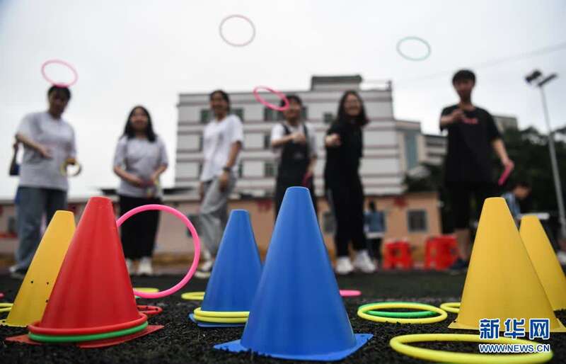 6月1日,广西河池市都安瑶族自治县高级中学高三学生在操场上玩套圈圈游戏。新华社记者 张爱林 摄