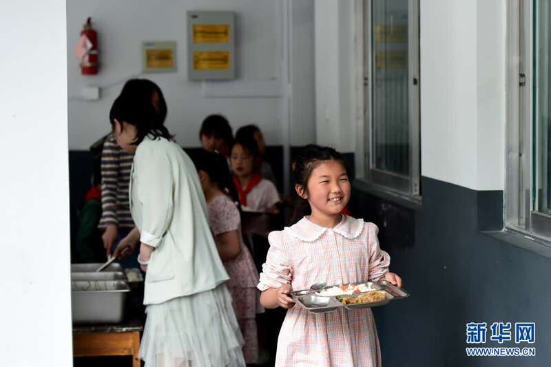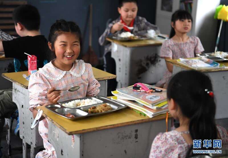 5月28日,张清语在璜尖中心小学打午饭。新华社记者 黄博涵 摄