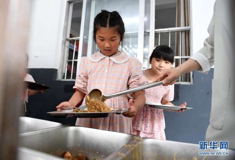 5月28日,张清语(前)在学校吃午饭。新华社记者杜宇摄