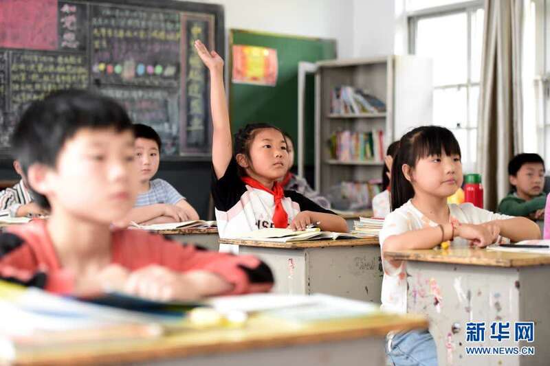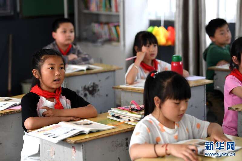 5月27日,张清语(左一)在璜尖中心小学上课。新华社记者杜宇摄