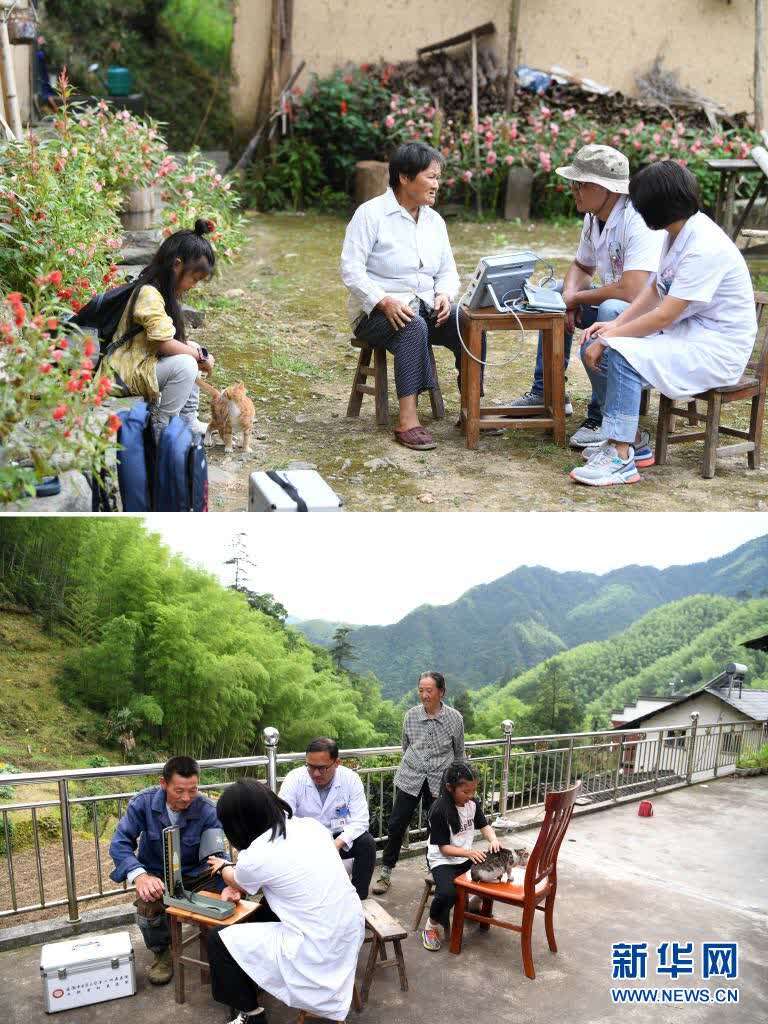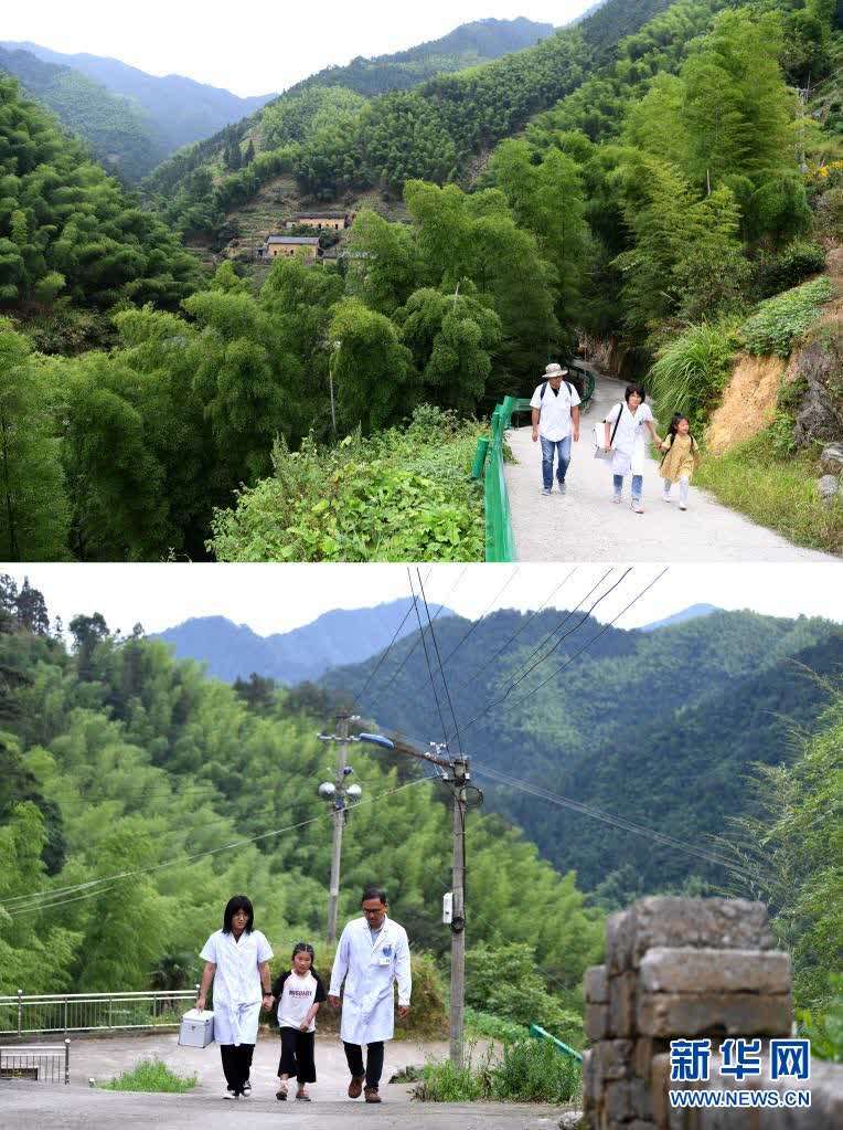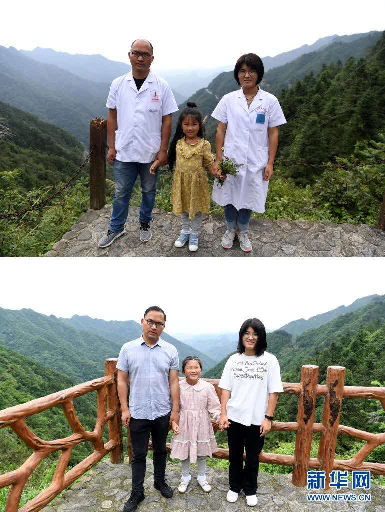 这是一张拼版照片,上图为:张清语和父母一起来到清溪村开展医疗走访(2019年8月31日摄);下图为:5月27日,张清语和父母一起来到清溪村开展医疗走访。新华社记者刘军喜摄