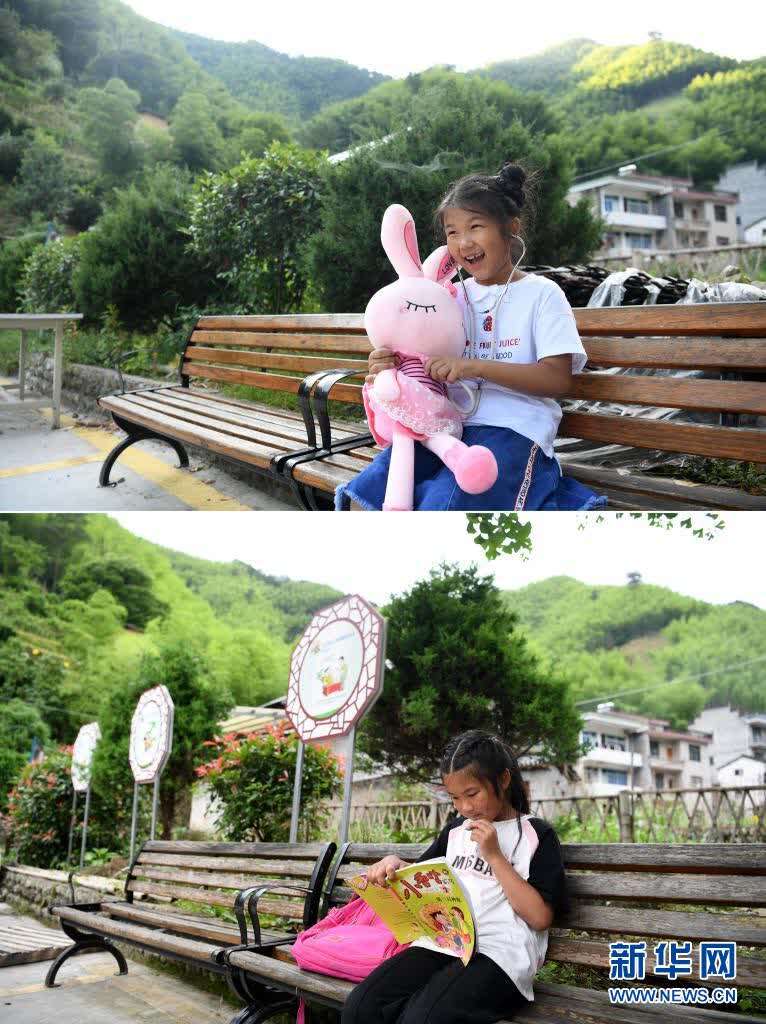 这是一张拼版照片,上图为:张清语在清溪村卫生室门前的广场上玩耍(2019年8月30日摄);下图为:5月27日,张清语在清溪村卫生室门前的广场上看书。新华社记者刘军喜摄