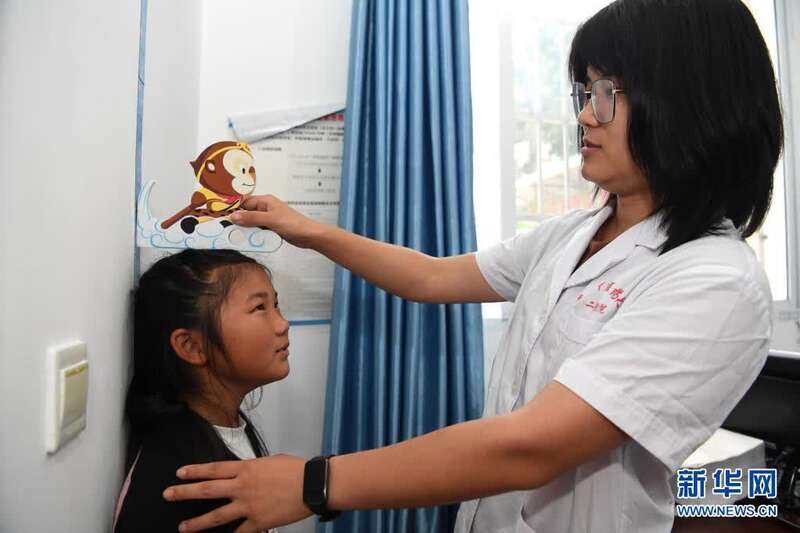 5月27日,在清溪村卫生室,妈妈徐晓婵给张清语测量身高。新华社记者刘军喜摄